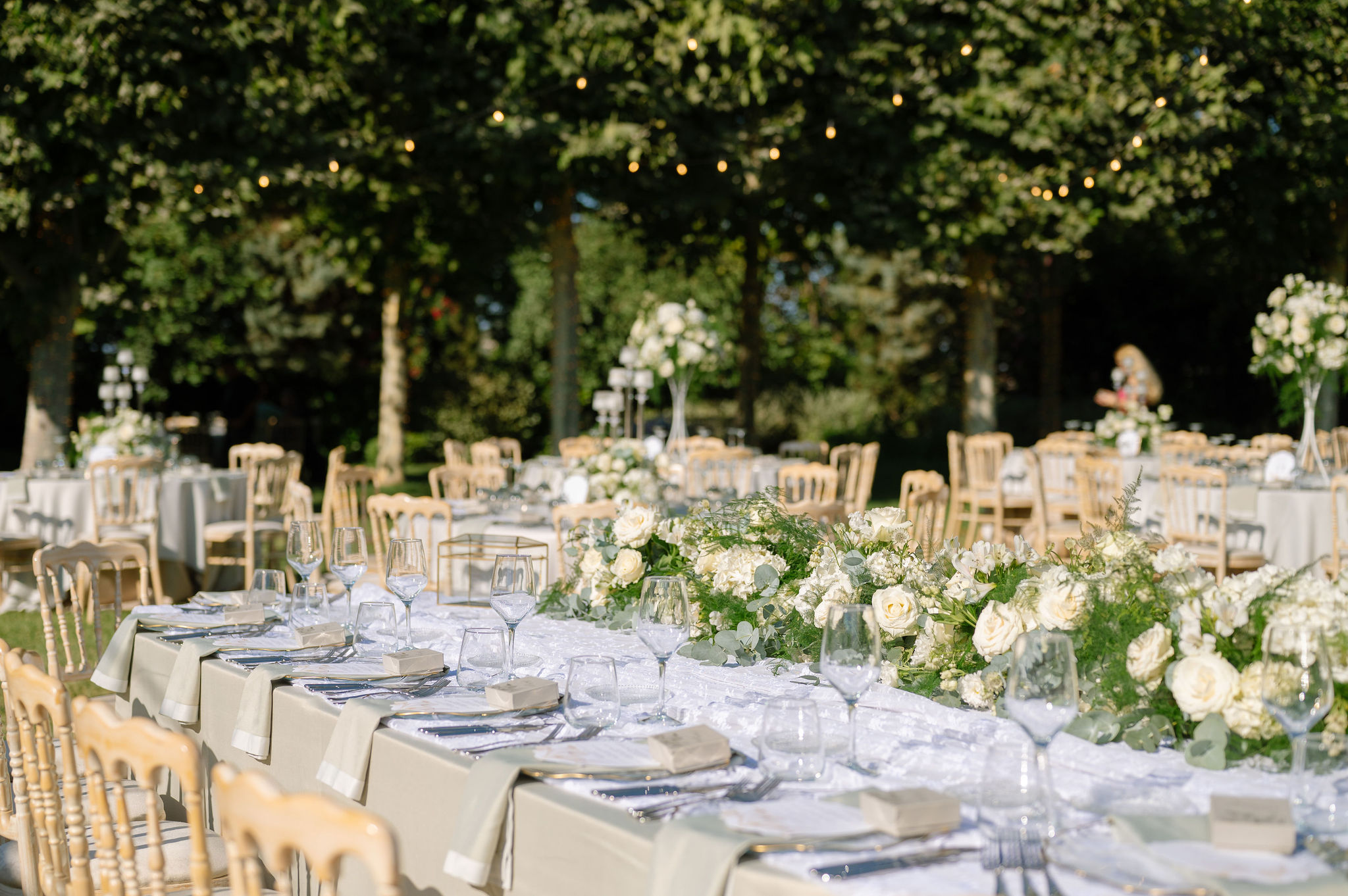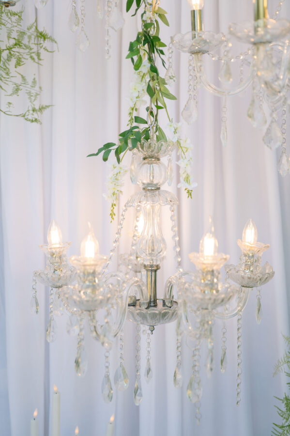 The wedding design was a blend of luxury and nature: crystal chandeliers, white flowers and lush greenery decorated the venue, while every detail reflected the couple’s refined taste.